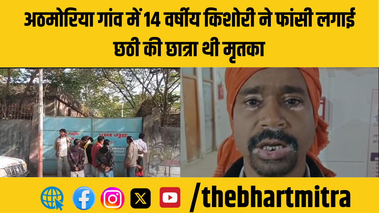 अठमोरिया गांव में एक 14 वर्षीय किशोरी द्वारा फांसी लगाकर जान देने की दुखद घटना सामने आई है। मृतका खुशी कुमारी, मलहरा स्कूल रिखिया की कक्षा छठी की छात्रा थी।